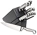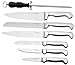 SmartBargains Style #3010574021With sleek, contemporary, satin-finish stainless-steel handles, the five stainless-steel kitchen knives and six stainless-steel steak knives in this set equip the kitchen and dining room for every essential need. Sculpted bolsters give the knives balance and provide control. The five kitchen knives: 8-inch chef's for rocking through chopping tasks, 8-inch slicer for carving roasts and poultry, 8-inch bread with serrated edge for slicing crusty loaves, 5-inch utility with serrated blade for tomatoes and other soft vegetables and fruits, and 3-1/4-inch paring. The 4-1/4-inch steak knives have serrated tips. Included in the set are an 8-inch sharpening steel to keep edges aligned and 8-inch kitchen shears with a bottle opener between the handles. All pieces fit into a stylish, black, hardwood storage block slanted for easy access. The knives are dishwasher-safe but should be hand washed to preserve edges. --Fred Brack Read more